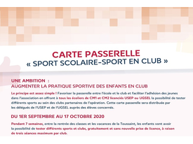 Dans la perspective de la reprise des activités pour les jeunes scolaires de vos clubs au moment de la rentrée de septembre 2020 le Comité National Olympique et Sportif Français a décidé en relation avec l’USEP et l’UGSEL de lancer une opération permettant la découverte du sport en clubs pour les élèves de CM1 et de CM2 au travers d’une opération intitulée « Carte passerelle Sport scolaire / Sport en club ». ...