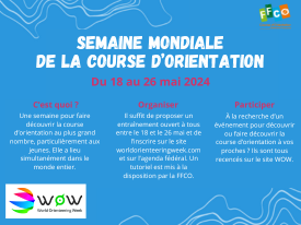 La semaine mondiale de la course d'orientation (ou World Orienteering week) aura cette année lieu entre le 18 et le 26 mai. Elle représente une opportunité de communiquer sur notre activité auprès des jeunes. C'est pourquoi, nous souhaitons encourager les clubs à proposer des événements.